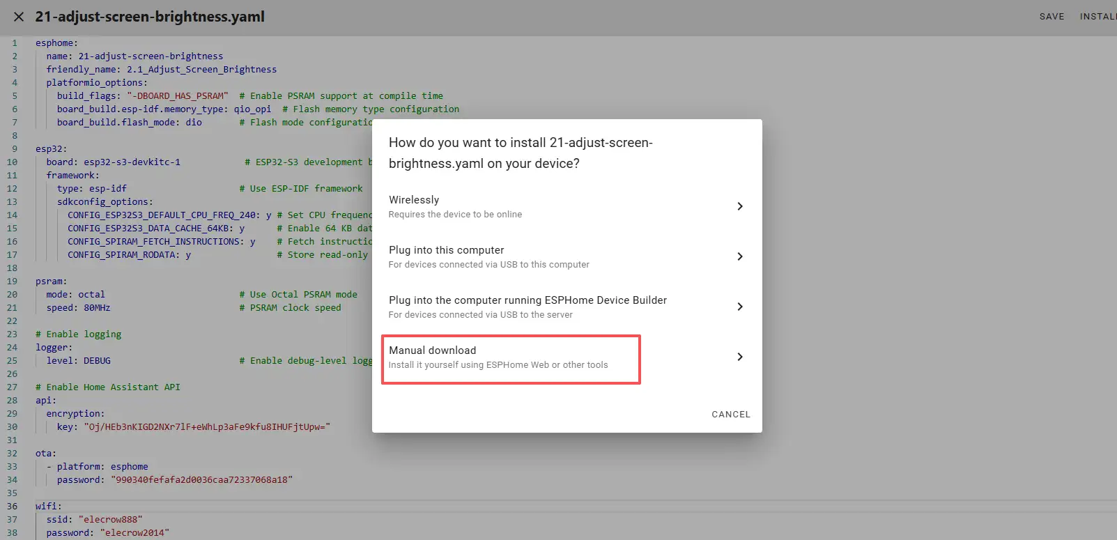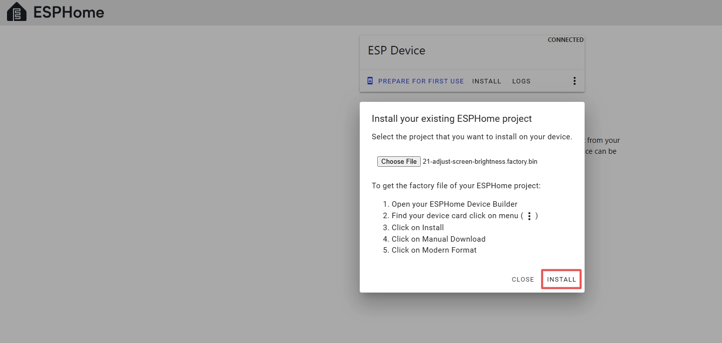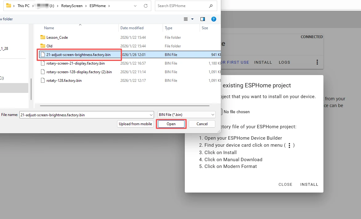 After connecting the CrowPanel 2.1inch-HMI ESP32 Rotary Display, click "Install."