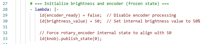 This "globals" code defines two global variables: "brightness_value" stores the current screen brightness as an integer (0–100), with an initial value of 50, meaning the default brightness at startup is 50%; "encoder_ready" is a boolean flag controlling whether the knob can respond to user operation. Its initial value is "false," indicating that the knob is temporarily disabled during startup or initialization to prevent false touches. This design allows the system to complete brightness and display initialization first, then safely allow the user to adjust the knob.