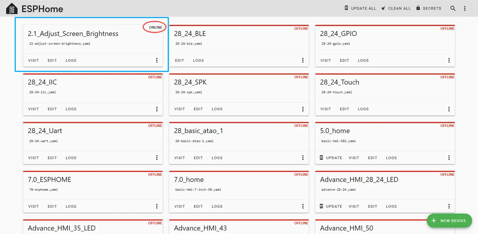Restart the ESP32 display, and you should see the device you created earlier show as ONLINE in the top right corner.