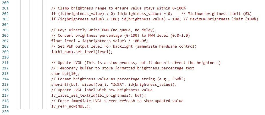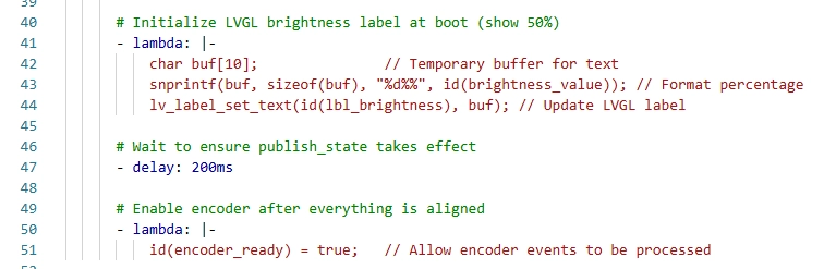 The purpose of this code is to initialize the brightness variable and the percentage text on the display to 50% at startup, display it through the LVGL label "lbl_brightness," wait 200ms to stabilize the display and internal state, and finally set "encoder_ready" to "true," unlocking the knob so it can respond to user operation. This design ensures that the screen display and internal brightness value are synchronized at startup and prevents false touches from causing brightness jumps during initialization, achieving smooth and safe alignment between interface display and operation logic.