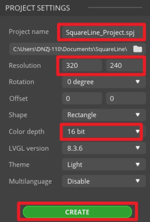 Set the name of the project, set the screen resolution to 320*240, set the color depth to 16bit, and keep other default settings. After setting, click CREATE to create the project.
