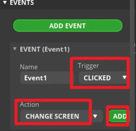 Complete the event. Here I choose to change the screen, and the screen to be switched is Screen1.