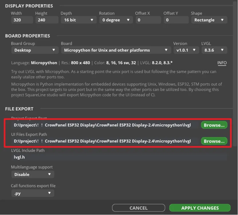 Open the SquareLine Studio and create a project. Select "Desktop"->"Micropython for Unix and other platform".