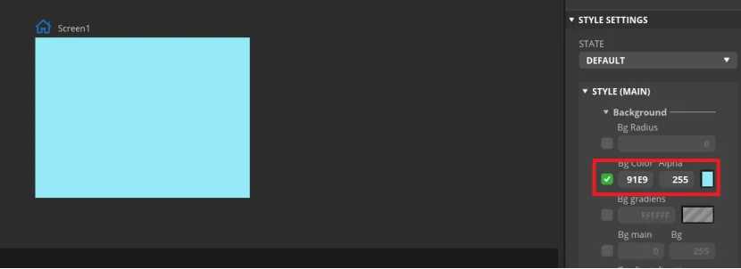 Find "Inspector"->"STYLE SETTING", click to expand "STYLE(MAIN)", then click the 1st "Background". Check the "Bg ColorAlpha" and set the backgroud color.