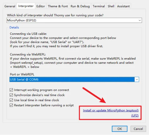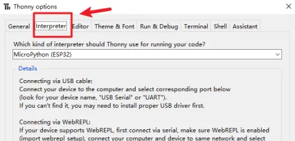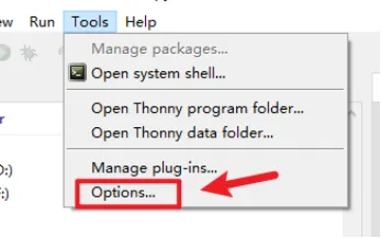 Open Thonny IDE and click "Tools"->"Options"->"Interpreter".