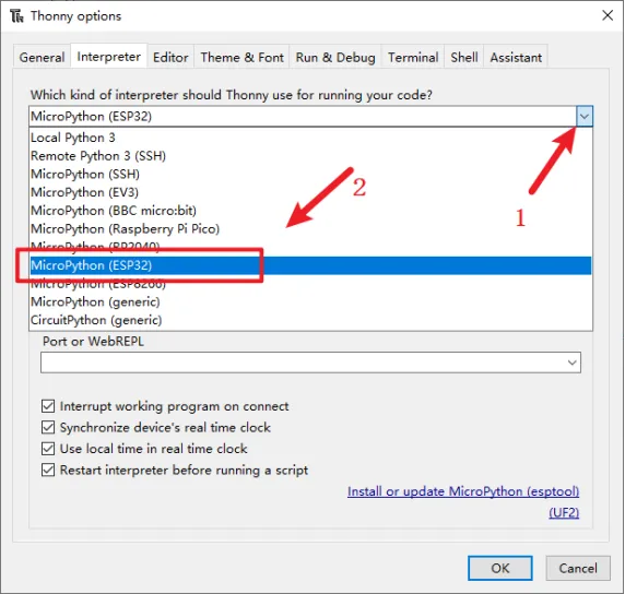 Select "MicroPython(ESP32)" for interpreter.