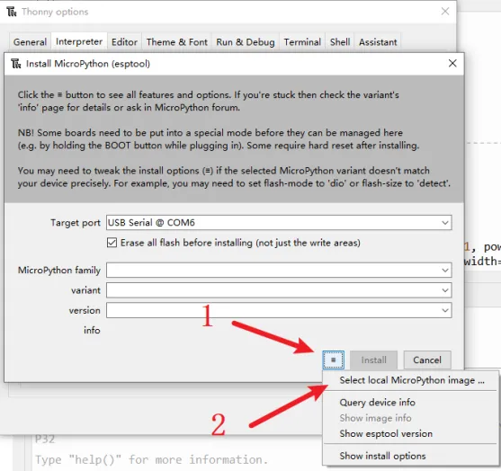 Click the icon with 3 lines, and click "select local MicroPython image...".Select the "lv_micropython.v1.19.1-ili9341-xpt2046.bin" and install.