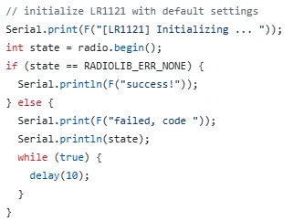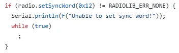 This code sets the LoRa synchronization word of the LR1121 module to 0x12, which is used to identify the communication network. If the setting fails, it prints the error message via the serial port and enters an infinite loop.