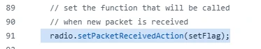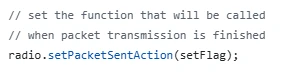This line of code is used to set the data packet transmission completion interrupt callback function for the LR1121 wireless module. By binding the custom setFlag function to the module's transmission completion interrupt event, it achieves that when LR1121 automatically completes the data packet transmission, it will immediately trigger the execution of the setFlag function through the hardware interrupt, thereby marking the transmission completion status. This is the core configuration for implementing non-blocking interrupt-based transmission, allowing the main program to execute other tasks without waiting for the transmission process.