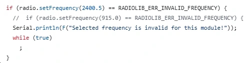 This code is used to set the LoRa working frequency of the LR1121 module to 2400.5 MHz. The function will return the setting result. If the detected frequency is illegal, it will output an error message via the serial port and enter a dead loop to stop the program from running.