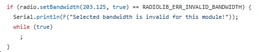 This code is used to set the LoRa signal bandwidth of the LR1121 module to 203.125 kHz. At the same time, it verifies the configuration result. If it detects that the bandwidth parameter is invalid, it will print an error message via the serial port and enter a dead loop to terminate the program.