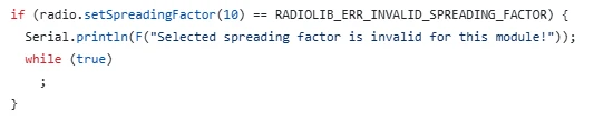 This code is used to set the LoRa spread spectrum factor of the LR1121 module to 10. The function returns the setting status. If the spread spectrum factor value detected is invalid, an error message will be output via the serial port and the program will enter a dead loop to stop running.