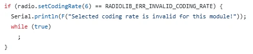 This code sets the LoRa encoding rate of the LR1121 module to 6. The function returns the setting status. If the encoded rate value detected is invalid, it will output an error message via the serial port and enter a loop to stop the program from running.