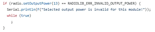 This code sets the transmission power of the LR1121 module to 13 dBm. The function returns the setting status. If the detected output power value is invalid, it will output an error message via the serial port and enter a dead loop to stop the program from running.