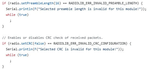 This code first sets the LoRa preamble length of the LR1121 module to 16. If the check fails, it will report an error and freeze. Then, it turns off the CRC data verification function and also verifies the configuration result. If it fails again, it will output an error and enter an infinite loop.