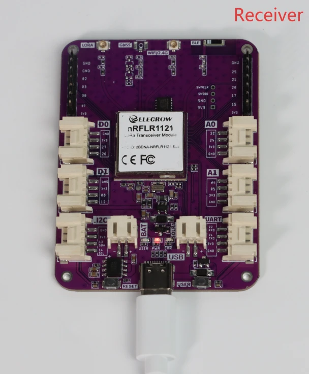 As shown in the figure below, prepare two nRFLR1121 modules and connect them to the computer respectively. After uploading the code, you can view the data sent by the transmitter on the receiver.
