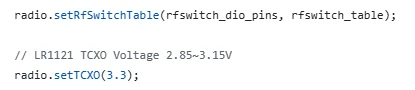 This code loads the previously defined RF switch pins and the mode table into the LR1121 module, enabling the chip to automatically control the switching between transmission and reception. At the same time, it sets the supply voltage of the TCXO crystal oscillator to 3.3V to ensure the stable operation of the module's clock.
