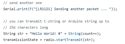 This code first prints a prompt message via the serial port to indicate that the first data packet is being sent. Then, it calls the "startTransmit" function to start the LoRa asynchronous transmission, sends the string "Hello World!" and saves the transmission status to the "transmissionState" variable.