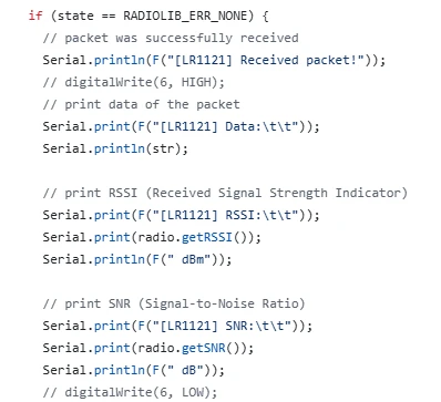 This is the main loop function of the LR1121 receiving program. The program will execute in an infinite loop. The core is to achieve efficient non-blocking LoRa data reception processing through the interrupt flag:The function first checks whether the receivedFlag flag is set to true, thereby determining whether the module has received a new data packet through the hardware interrupt.