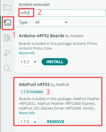 In the search box, type "Adafruit nRF52", find "Adafruit nRF52 by Adafruit", and click "Install".(Here we are using version 1.7.0.)