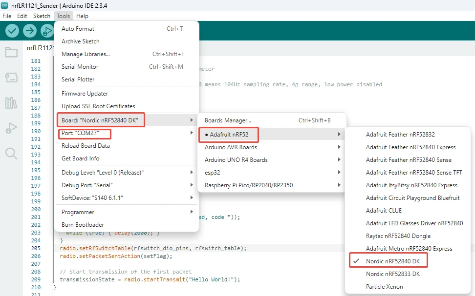 Lastly, here are some points to keep in mind during actual operation:Since the nRFLR1121 uses the nRF52840 as the main control chip, you need to install the nRF52 development board.