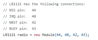 LR1121 radio = new Module(44, 40, 42, 43) creates an instance of the LR1121 chip named radio using the Module class from the RadioLib library in the specified pin order. This establishes a binding between the software object and the hardware chip, laying the foundation for subsequent calls to radio.begin(), radio.setFrequency(), etc., and the pin numbers must be consistent with the actual hardware wiring; otherwise, the chip will not be able to communicate normally.