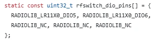 The DIO5 and DIO6 pins of the LR1121 chip are designated as the RF switch control pins through the rfswitch_dio_pins array. The remaining pins are not connected.