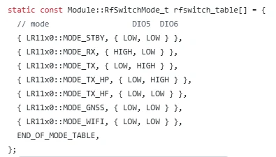 Furthermore, through the rfswitch_table mode table, the high and low level states of DIO5 and DIO6 pins under different working modes such as standby, reception, transmission, GNSS, and WiFi are defined. This enables the chip to automatically switch the RF path to achieve normal wireless transmission and reception as well as functional switching.