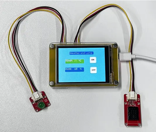 The example tutorial is an environmental monitoring project, demonstrate how to create a UI and use a DHT20 sensor to obtain the environment temperature and humidity and display it on the screen; and how to control the LED on and off by the buttons on the screen.