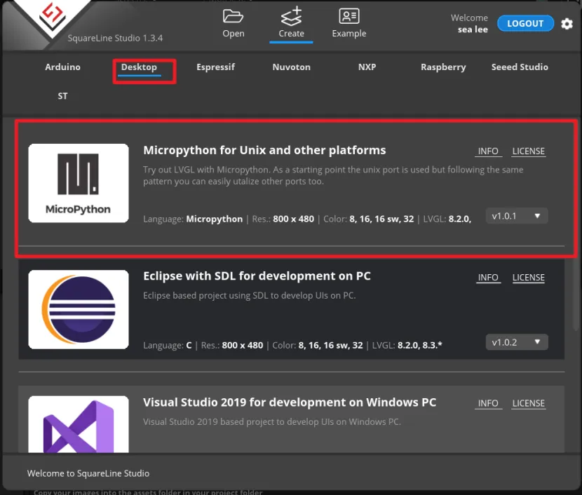 Open the SquareLine Studio and create a project. Select "Desktop"->"Micropython for Unix and other platform".