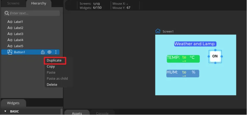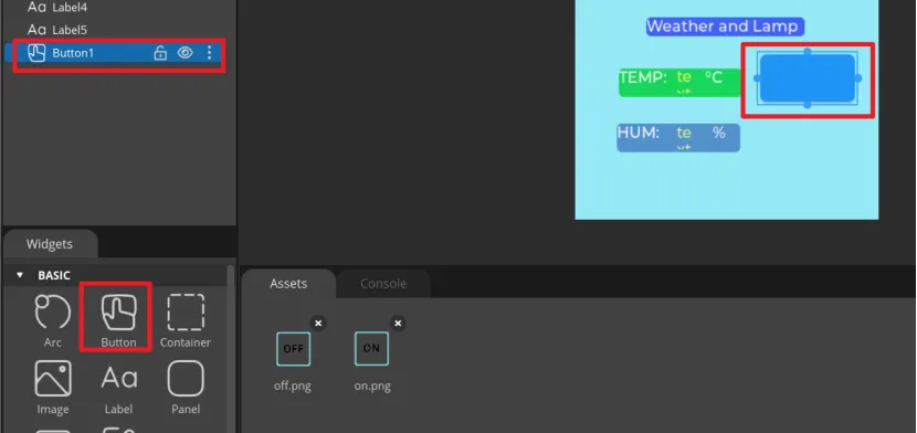 Click "Button" in the "Widgets" area, and "Button1" will be added to the current Screen.