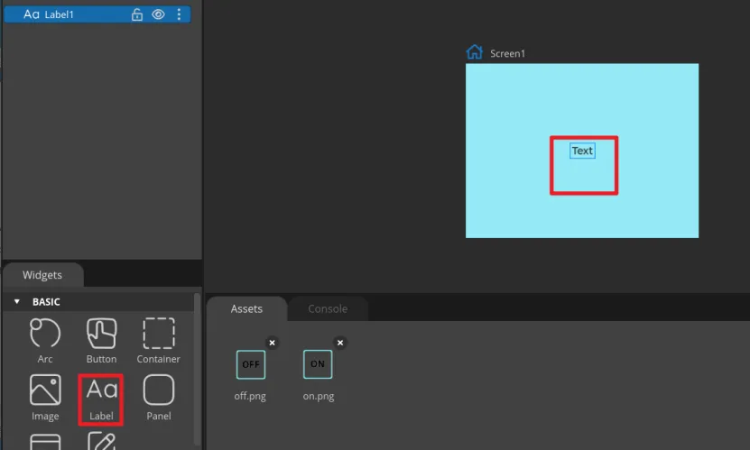 Click "Label" in the "Widgets" area, and "Label1" will be added to the current Screen.