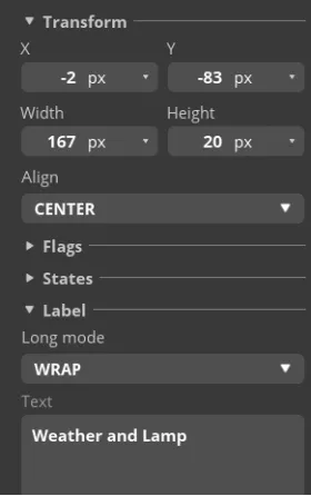 The position and size of the label can be adjusted by dragging the mouse. You can also directly enter numbers in the Inspector→BUTTON→Transform to adjust.