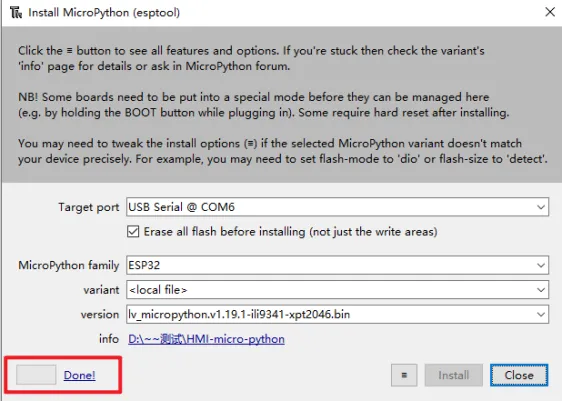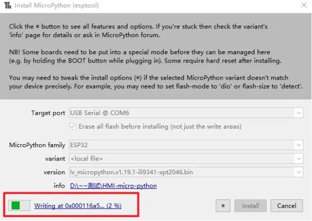 Click the icon with 3 lines, and click "select local MicroPython image...".Select the "lv_micropython.v1.19.1-ili9341-xpt2046.bin" and install.