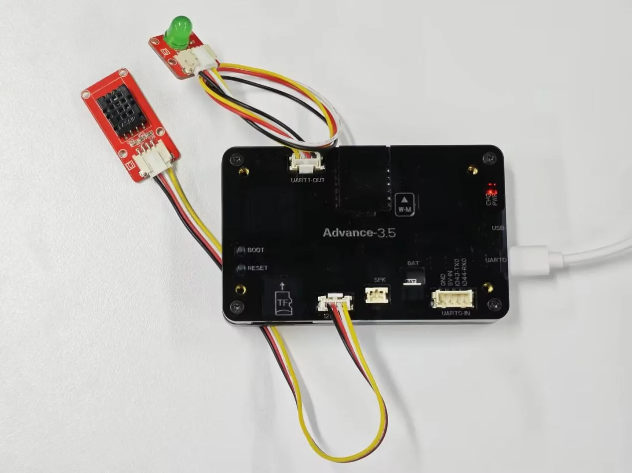 This lesson will use the IIC interface and UART1-OUT interface of this series of products to collect data from temperature and humidity sensors. When the temperature exceeds the threshold, the light bulb will automatically light up.