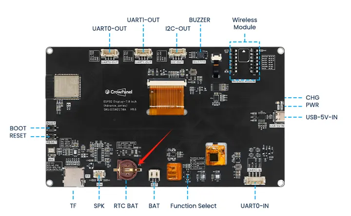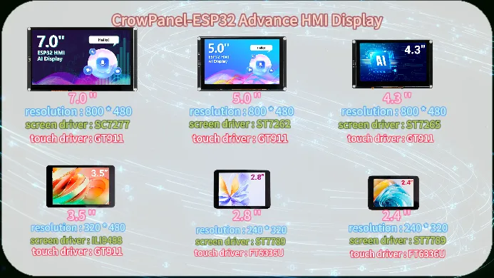 The CrowPanel-ESP32 Advance HMI Display product is divided into 6 sizes, namely 7.0 inches, 5.0 inches, 4.3 inches, 3.5 inches, 2.8 inches, and 2.4 inches.Its main control chip uses ESP32-S3 as the core of the man-machine interface.
