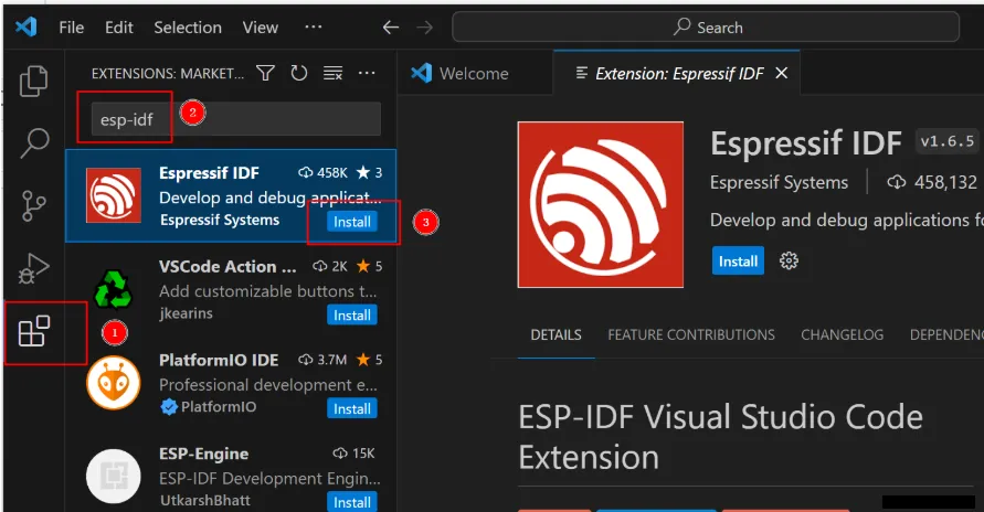 Click [Install] for the esp-idf extension.