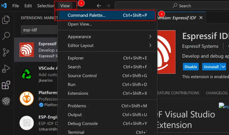 Search for keywords such as espressif, esp-idf, esp32, esp32s2, etc. in the Extensions.