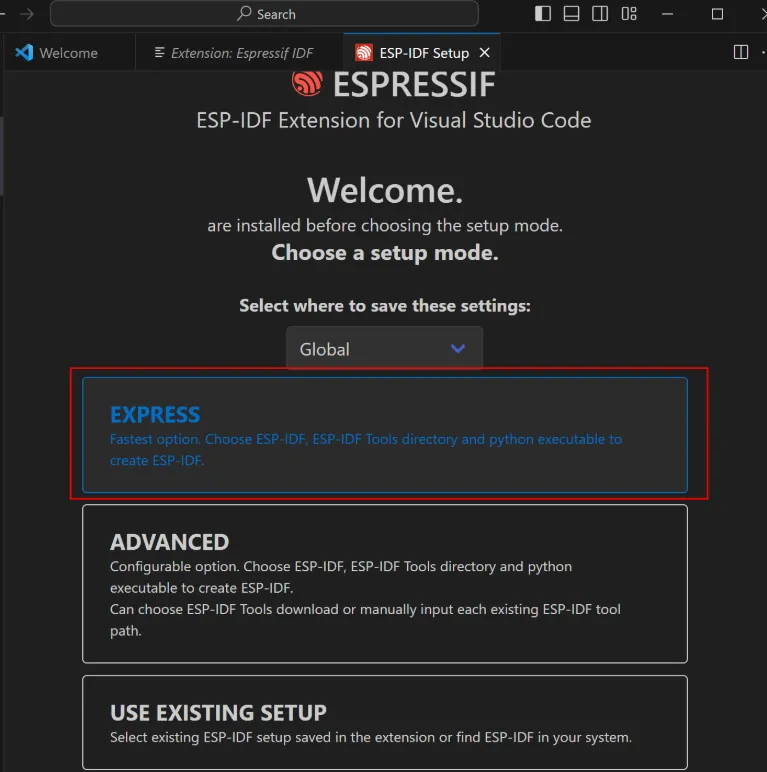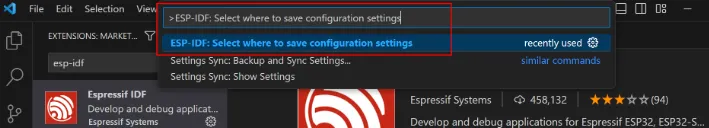 Or press the F1 shortcut key to open the command palette and enter in the command palette: ESP-IDF: Select where to save configuration settings.