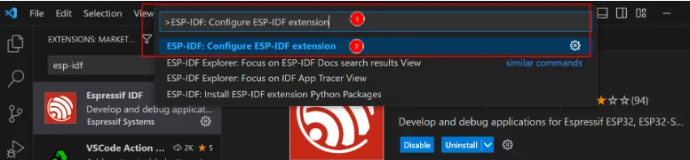 Then enter "ESP-IDF: Configure ESP-IDF extension" in the command palette, and click to select "ESP-IDF: Configure ESP-IDF extension".