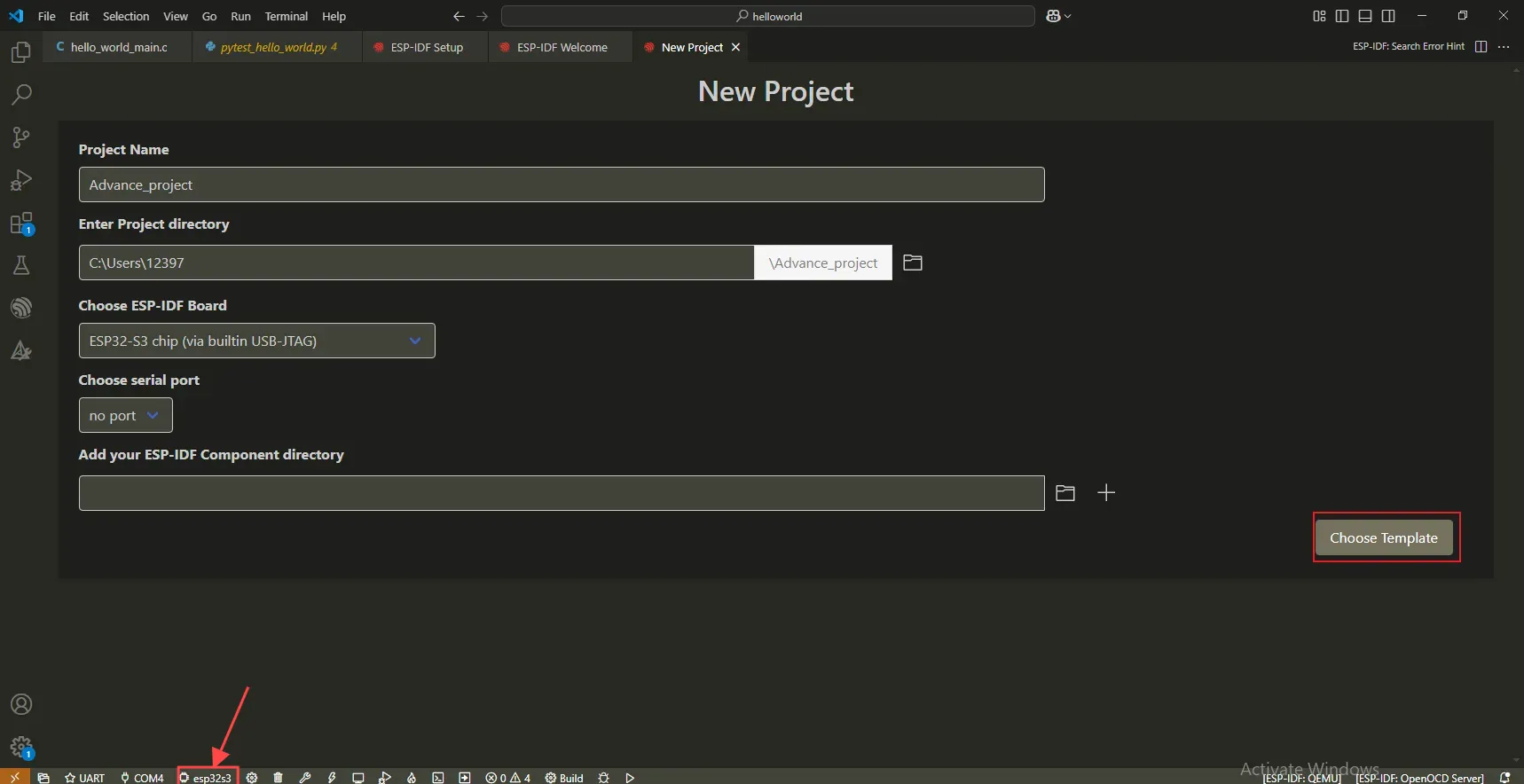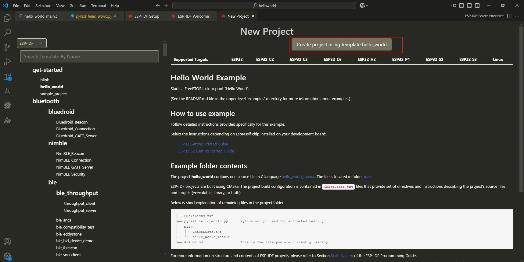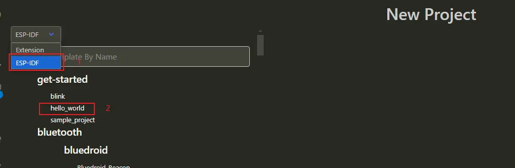 Select an official Espressif example and choose the “hello_world” template.
