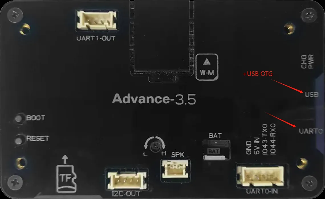 For 2.4-inch, 2.8-inch, and 3.5-inch, there are two USB ports here. When using the USB port for code burning, you need to first hold down the BOOT button, then press the RESET button, and then release them together to burn the code; The UART0 interface allows for direct code burning without the need to press any buttons.