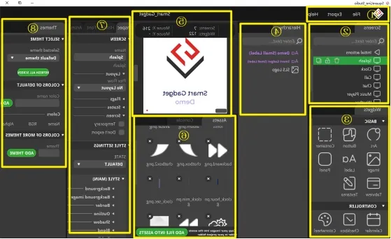 ①Toolbar, including File, Export, and Help. Basic file operation bar, create or open files, export UI files and other operations. Click help and there are related introductory documents.
