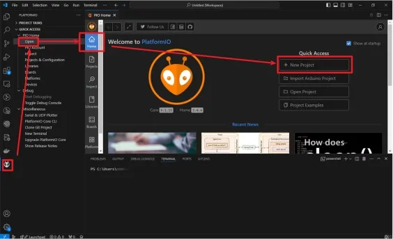 Click the PlatformIO icon, click QUIK ACCESS 'Open', then click '+New Project'.