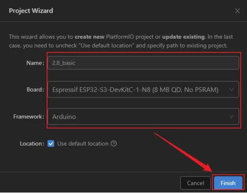 Add a project name. Select "Espressif ESP32-S3-DevKitC-1-N8" for the board and Arduino for the framework.(In this lesson, the 2.8-inch development board is taken as an example.)