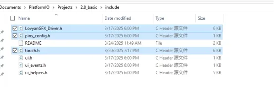 Similarly, add the display driver and pin definition header files to the include folder.