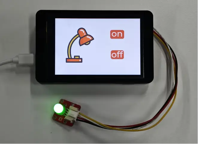 The example tutorial is a PlatformIO project, which demonstrates how to create a new project using PlatformIO, display UI graphics with LVGL, and control the on and off of a small light bulb connected to the UART port of the Advance development board according to the touch input on the screen.