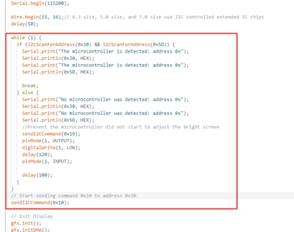 sendI2CCommand(0x10) means sending the 0x10 command to the microcontroller (0x30) to instruct the microcontroller to set the screen brightness to maximum.