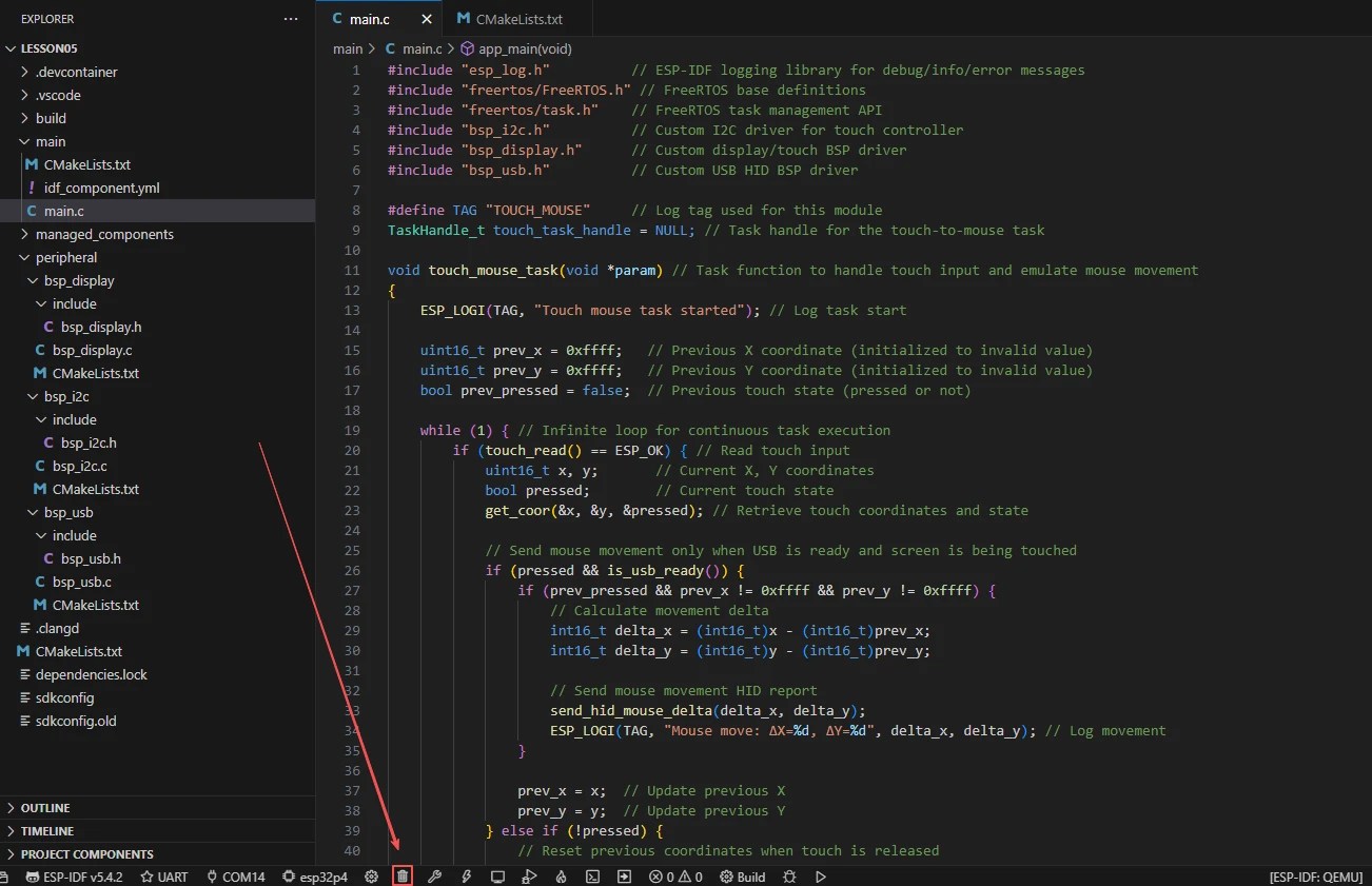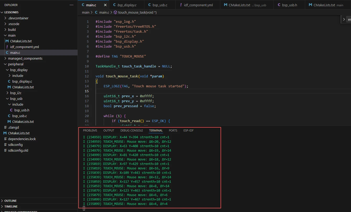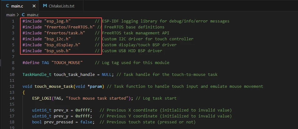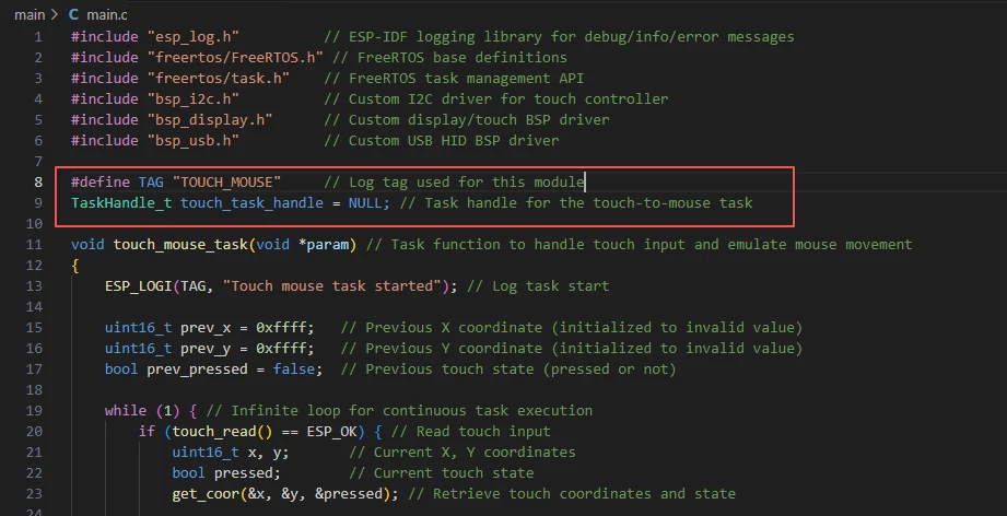 After successful initialization, it creates a FreeRTOS task named touch_mouse_task to continuously read the touch screen input and convert it into mouse movement signals, and finally starts the entire touch mouse application.\