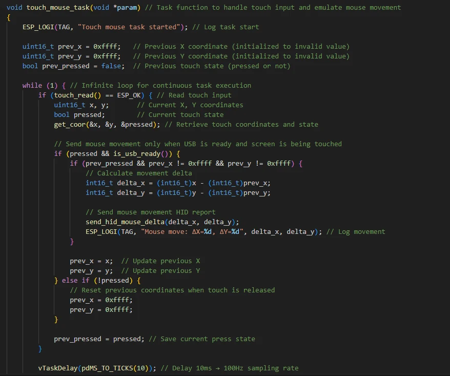 This function, named touch_mouse_task, serves to convert the finger movements on the touch screen into USB HID mouse movements. It continuously reads the touch screen coordinates and press status within an infinite loop. When the touch screen is pressed and the USB HID device is ready, it calculates the incremental movement (delta) of the finger and sends the mouse movement report to the computer via send_hid_mouse_delta; when the finger is released, it resets the previous coordinates. The entire process cycles at a 10ms interval, achieving a mouse sampling rate of approximately 100Hz.